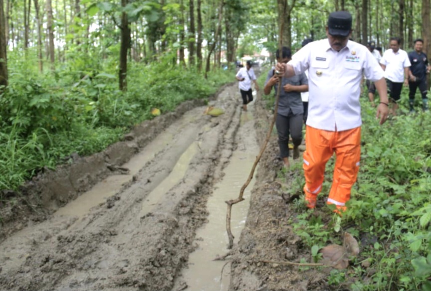 Bupati Marhaen Djumadi datang bersama jajaran Dinas PUPR Nganjuk dan Forkopimcam Jatikalen, untuk melihat langsung titik kerusakan jalan sepanjang empat kilometer, yang menjadi satu-satunya akses warga Dusun Tegalabe menuju sekolah.