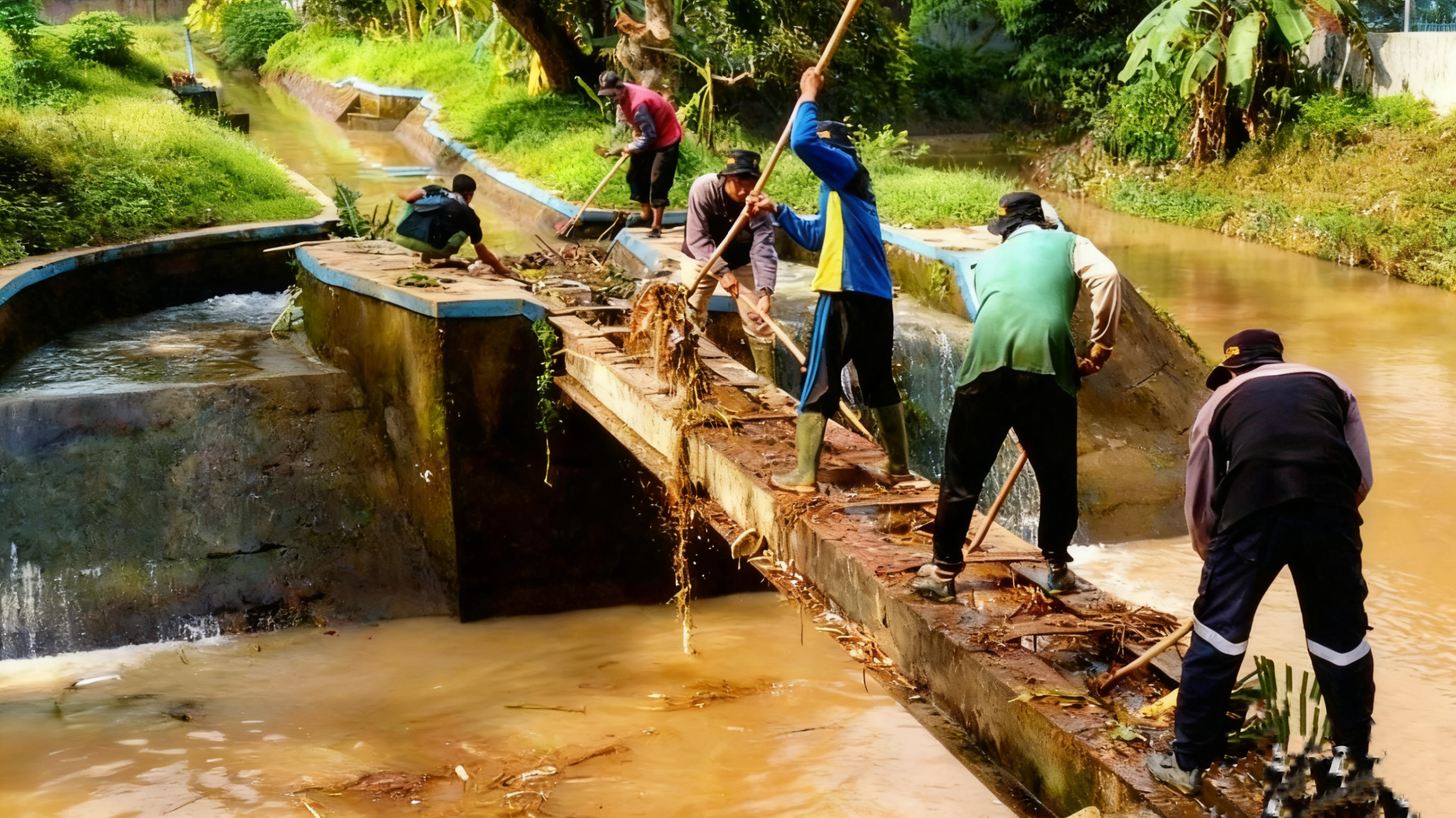 Banjir yang terjadi beberapa waktu lalu telah menyebabkan penumpukan berbagai material seperti bambu, ranting kayu, lumpur, dan sampah rumah tangga yang menyumbat aliran air. Kondisi ini berpotensi mengganggu distribusi air irigasi menuju lahan pertanian warga jika tidak ditangani secara teknis dan menyeluruh.