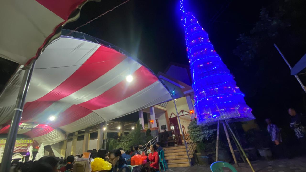 SR JATIM, Nganjuk – Pemandangan berbeda tersaji di pelataran Greja Kristen Jawi Wetan (GKJW) Aditoya, Desa Jatigreges, Kecamatan Pace, Kabupaten Nganjuk. Menyongsong Natal 2025, jemaat gereja tertua di Kabupaten Nganjuk ini berhasil mencuri perhatian publik dengan mendirikan pohon Natal megah setinggi 12 meter yang seluruhnya terbuat dari limbah botol plastik.