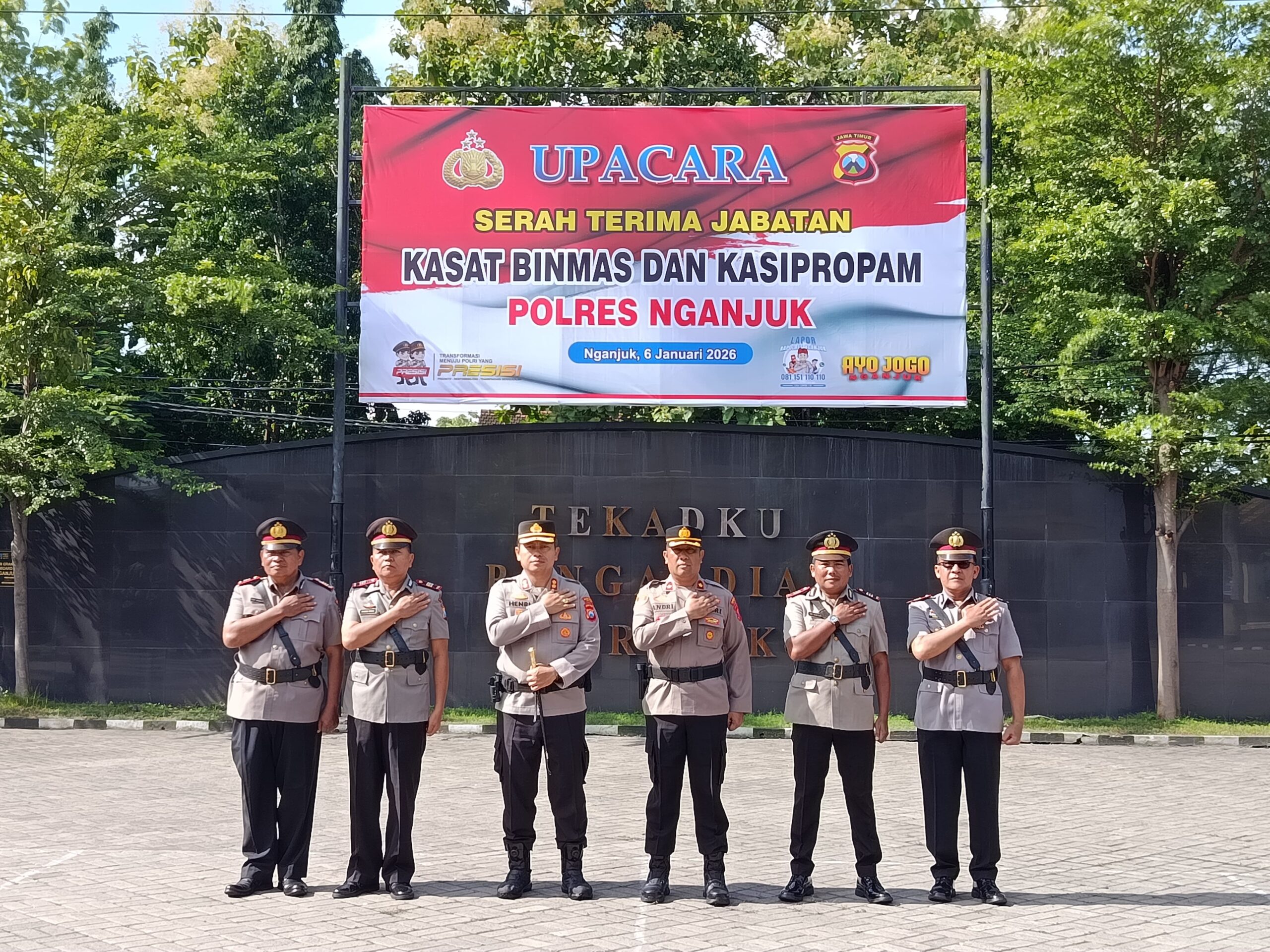 Upacara sertijab ini ditutup dengan pemberian ucapan selamat dari seluruh personel Polres Nganjuk kepada para pejabat baru, menandai dimulainya babak baru pengabdian mereka di Bumi Anjuk Ladang.